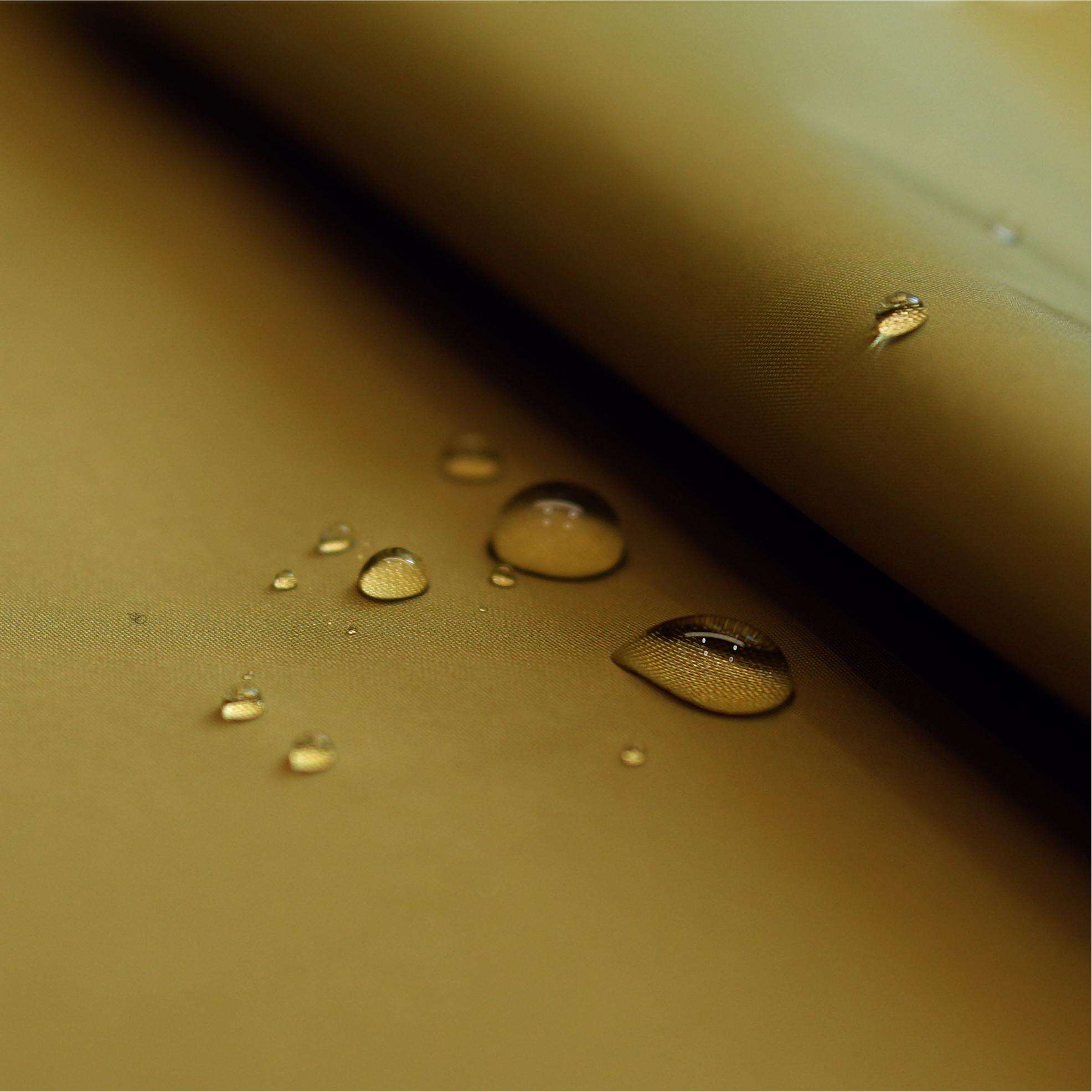 Napędzany technologią odpychającą wodę AquaShield, materiał tworzy efekt liścia lotosu —naprężenie powierzchniowe sprawia, że woda formuje krople i natychmiast spływa, pozostawiając materiał czysty i suchy.